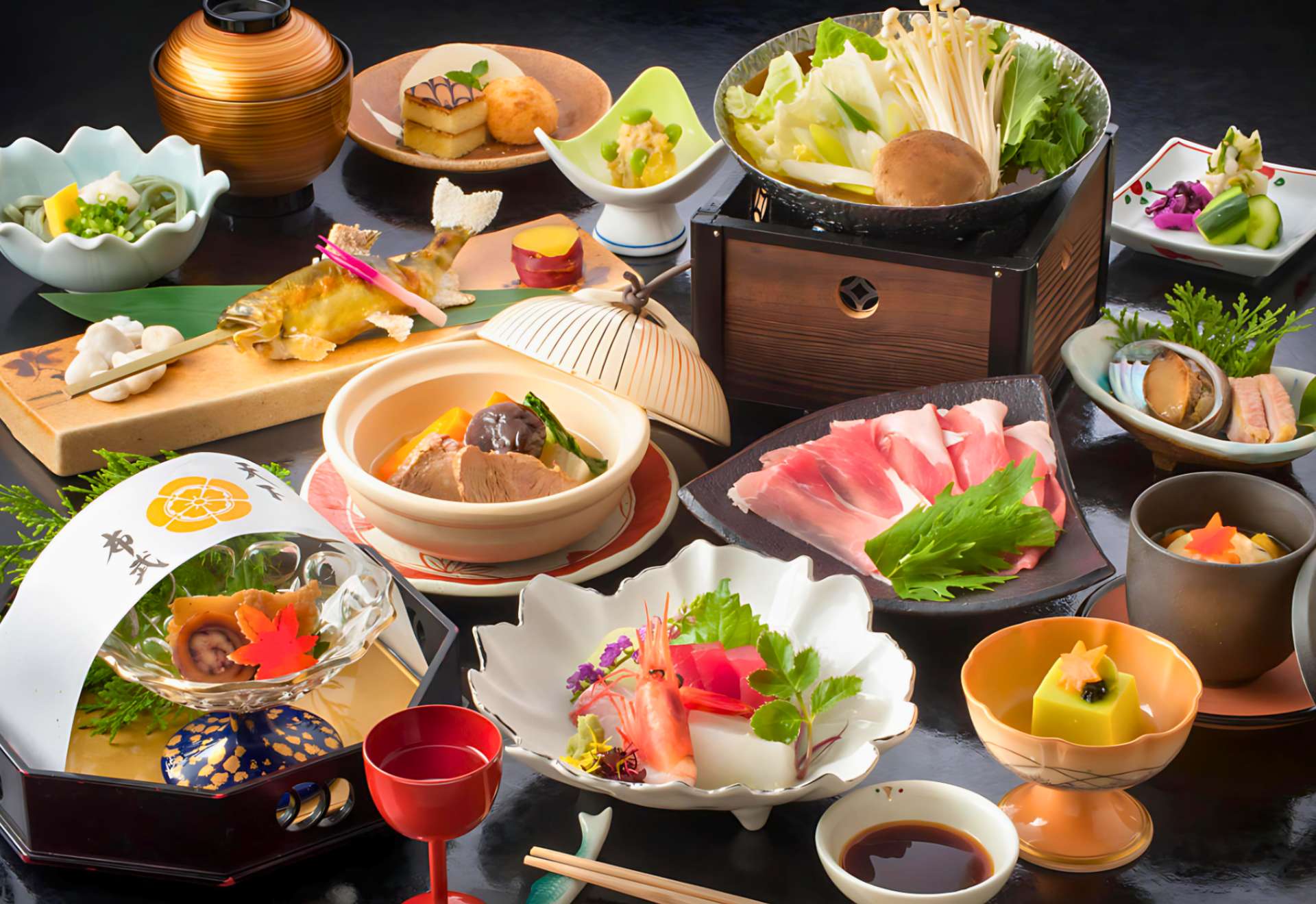 • Lunch is a luxurious kaiseki meal made from nature's rich bounty and the local culture, including salt-grilled sweetfish, sarasa salmon, and recreations of the cuisine that the local fishermen dined on and more! The miso tsuyu soup for the Hotel Park exclusive, Ikadashinabe, features an original blend with akamiso (red miso paste) as a base.