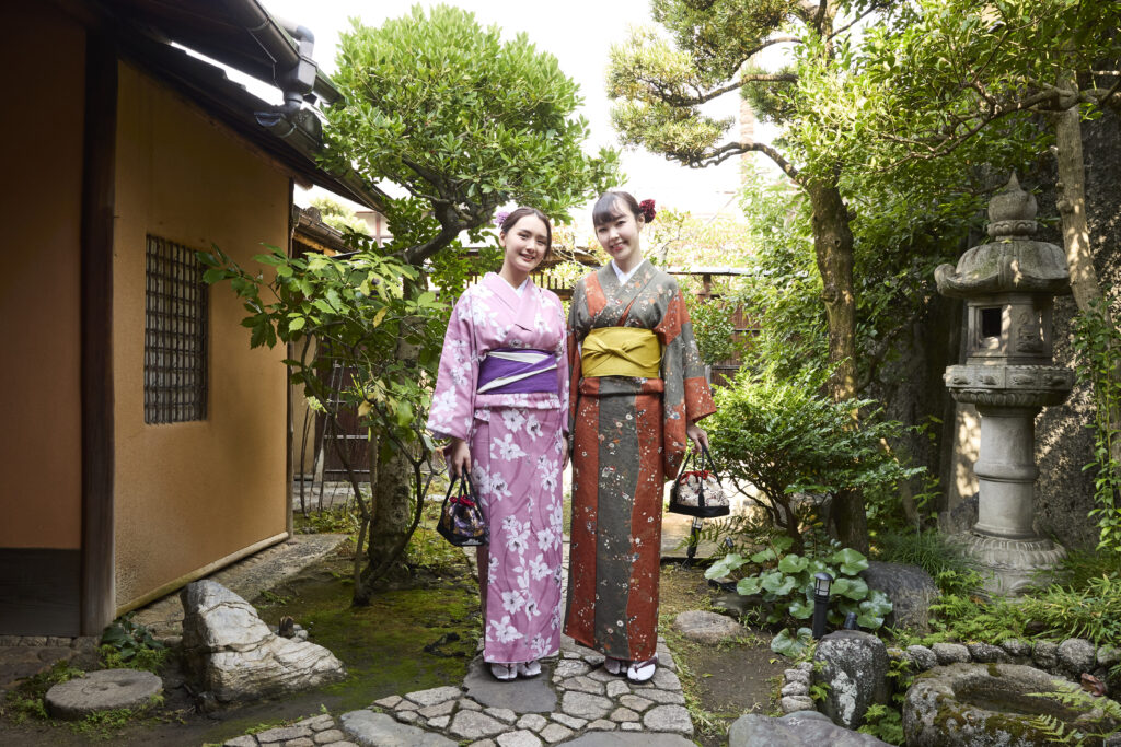 You can take many photos by wearing an authentic kimono in the beautiful Japanese gardens of Maikoya.