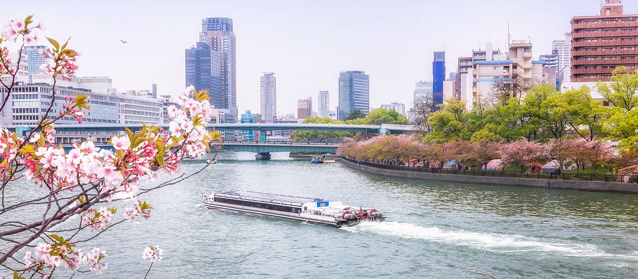 Enjoy seeing the seasonal scenery with a cruise along the Ogawa River aboard the Aqua Liner water bus. See a view of the famous places and historic spots of Osaka from the river.