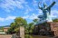 The Nagasaki Peace Park (平和公園, Heiwa Kōen) is a tranquil space that commemorates the atomic bombing of Nagasaki on August 9, 1945, which destroyed a significant portion of the city and killed tens of thousands of inhabitants. The complex is comprised of two parks and a memorial museum. In the center of the complex is the Hypocenter Park with a simple, black monolith that marks the explosion's epicenter. Not far from it stands a damaged pillar of the former Urakami Cathedral which was destroyed in the blast. Furthermore, there is an area that allows visitors to take a look at a layer of soil below the park's surface where broken roof tiles, bricks and pieces of glass remain from the explosion.