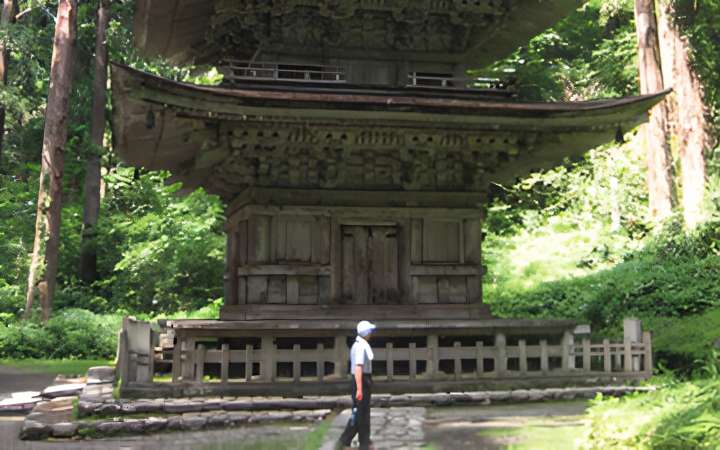 Historic wooden pagoda temple surrounded by lush forest in Japan’s sacred Dewa Sanzan mountains — a spiritual pilgrimage site with deep cultural and religious significance