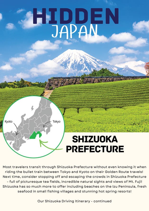 Most travelers transit through Shizuoka Prefecture without even knowing it when riding the bullet train between Tokyo and Kyoto on their Golden Route travels!