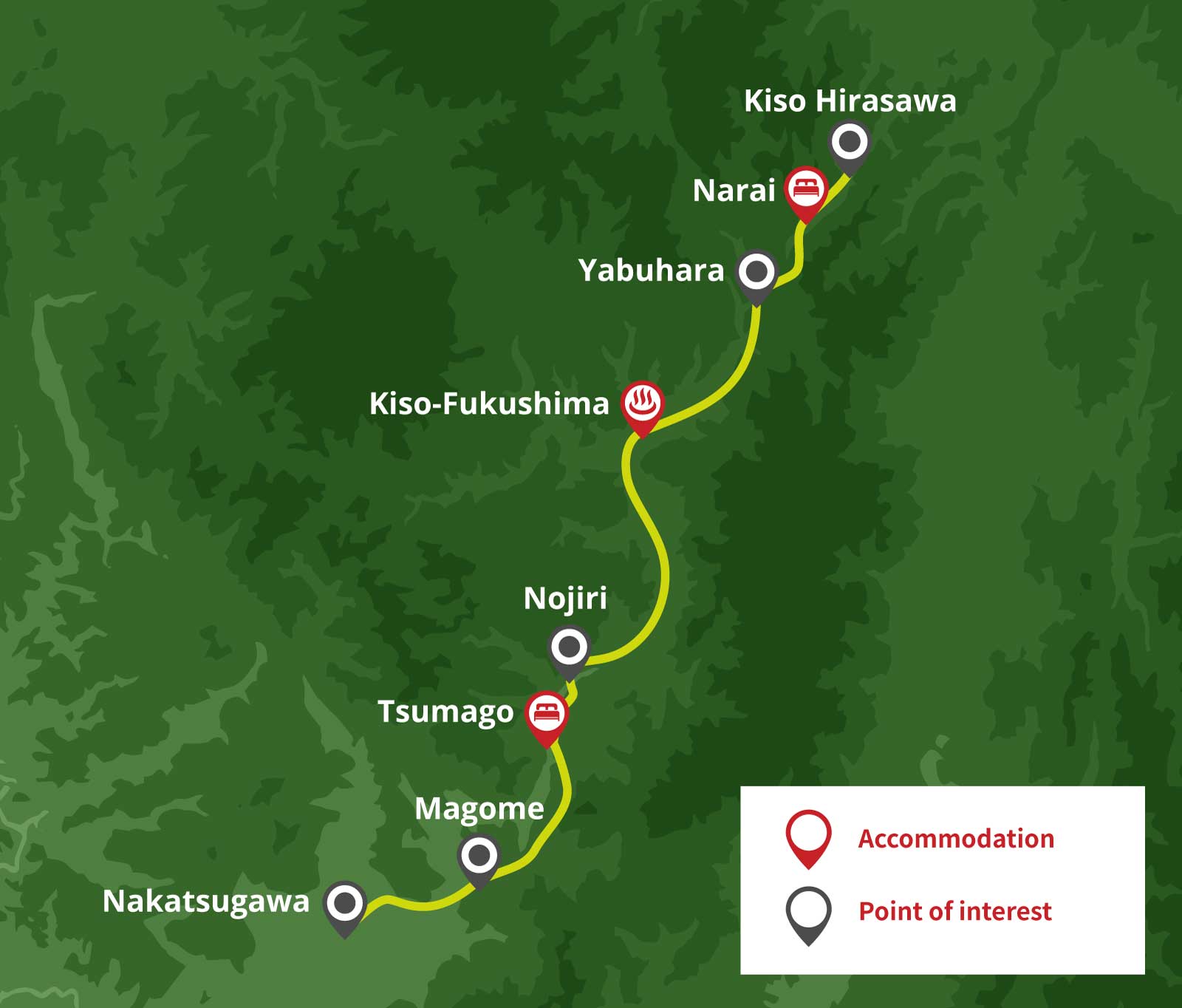 The longest day on the trail is a beautiful and varied hike from Tsumago to Nojiri. Or choose the shorter alternative to Nagiso instead. The trail travels through small valleys and past forests of bamboo and Japanese cedar, through some of the least-developed scenery on the tour. Continue by train to Kiso-Fukushima. Stay at a lovely hot-spring Ryokan set in a peaceful valley above the town. Complimentary transfer from the station is provided by the Ryokan. The Ryokan has lovely indoor and outdoor hot-spring baths.