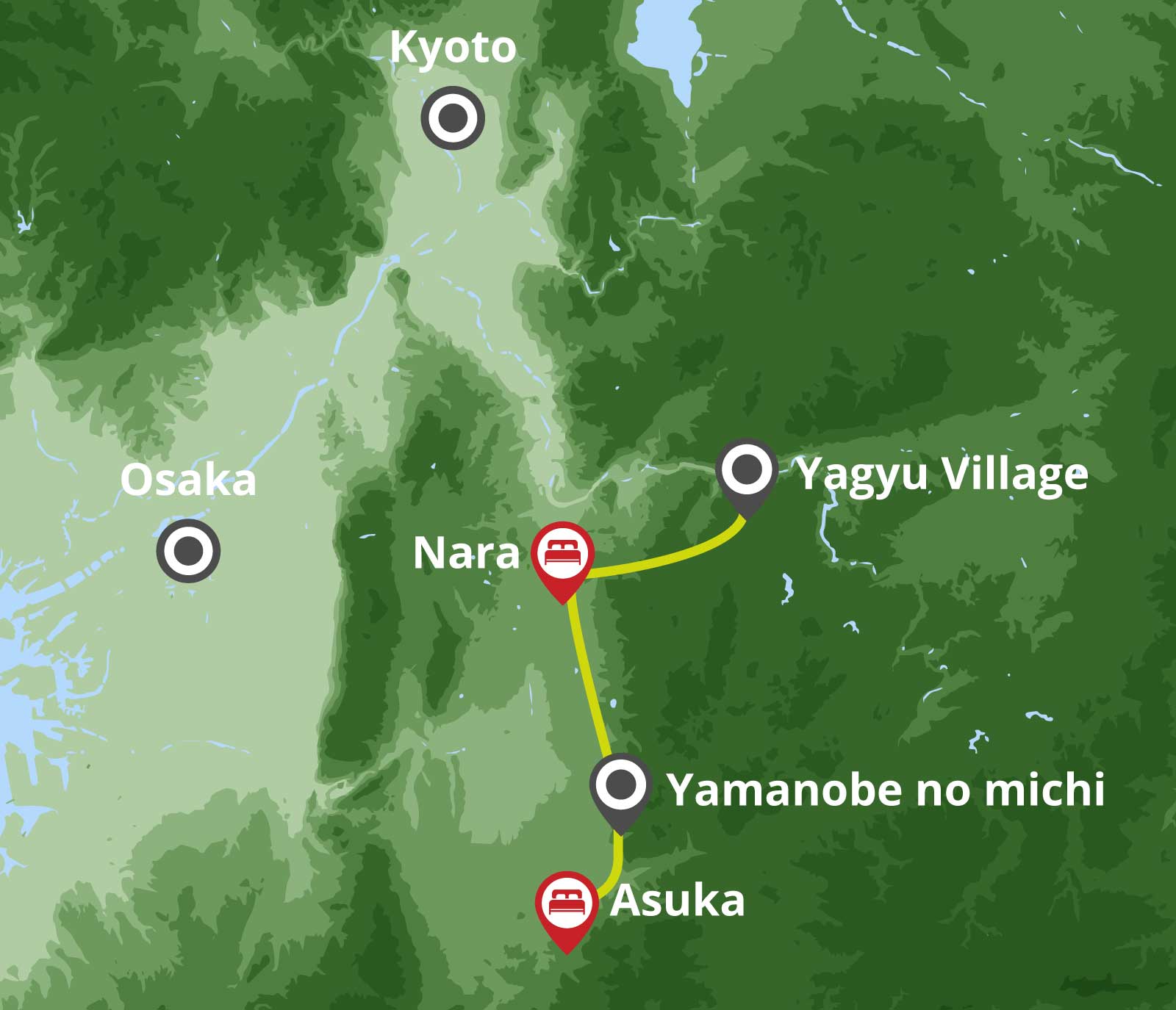 This morning, you can rent bicycles to visit Asuka’s wonderful, terraced rice fields. Afterwards, travel by train to Nara, Japan’s first permanent capital. Established in 710 and then known as Heijō-kyō, Nara abounds in cultural heritage, with many historic treasures and easy access to wonderful nature. You may instead choose to make an earlier start from Asuka and hike the historic Yamanobe-no-Michi trail before arriving at your accommodation in Nara this evening, a centrally located hotel.