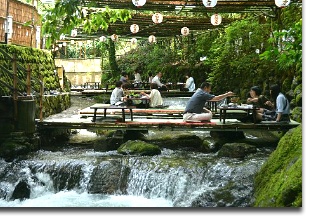 From June to September, Kibune’s restaurants build covered platforms out over the river where visitors can enjoy a meal as the water flows beneath them. Known as kawadoko, dining on the platforms is a relaxing experience and an excellent way to escape the summer heat. Most restaurants serve kaiseki meals that range in price from 3,000 to 20,000 yen per person. Reservations are recommended in the evenings and on busy days.
