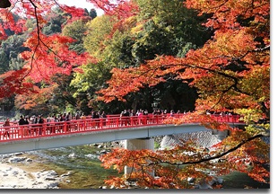Korankei (香嵐渓, Kōrankei) is a valley near Nagoya reputed to be one of the best spots for autumn colors in the Chubu Region. Shaping the valley is the 254 meter tall Mount Iimori, on which Kojakuji Temple stands. In the 17th century, the head priest of Kojakuji planted some maple trees along the temple approach, prompting many locals to do the same in the area. Today, visitors to Korankei can see the fruits of these past efforts, in the form of excellent autumn scenery that peak around mid to late November each year. The best colors tend to appear around the paths along Tomoe River at the western and southern sides of Mount Iimori. Visitors can enjoy lovely sights of maple tree tunnels and autumn colors in combination with views of the river and the few bridges across it. The vermillion Taigetsukyo Bridge is the symbol of Korankei and a great picture-taking spot.